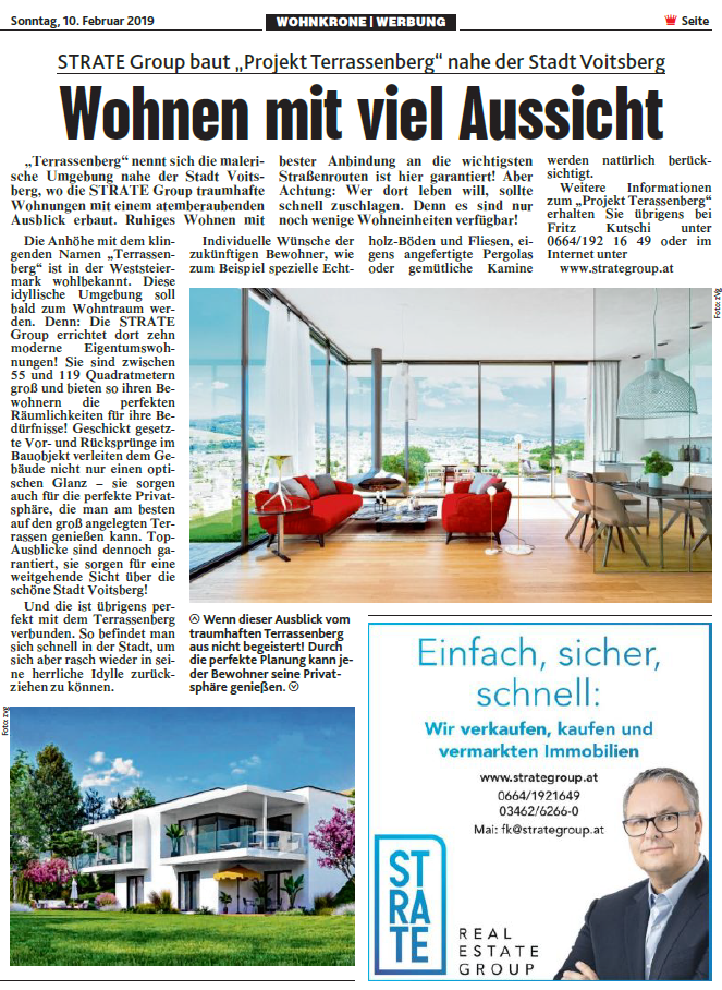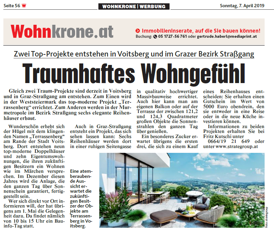weiterlesenGleich zwei Traum-Projekte sind derzeit in Voitsberg und in Graz-Straßgang am entstehen. Zum Einen wird in der Weststeiermark das top-moderne Projekt ‘Terrassenberg‘ errichtet. Zum Anderen werden in der Mur-metropole im Bezirk Straßgang sechs elegante Reihen-häuser erbaut.
